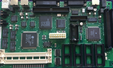 Once open, the power, floppy and hard disk cables can be unplugged and the motherboard removed. Close inspection of this machine showed that capacitor fluid had clearly got onto sensitive parts of the pcb.