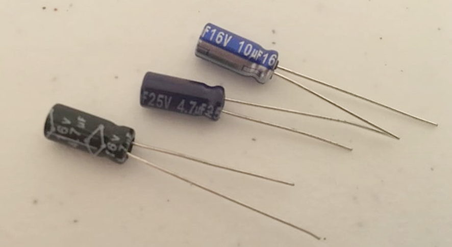 As you can see they are substantially larger and are obviously designed for through-hole mounting. The trick was to take advantage of the excess length of the legs to bend them into a shape, so that when the capacitor was laid horizontally, a portion of each bent leg ended up making reasonably firm contact with the pad (taking care with polarisation where necessary).